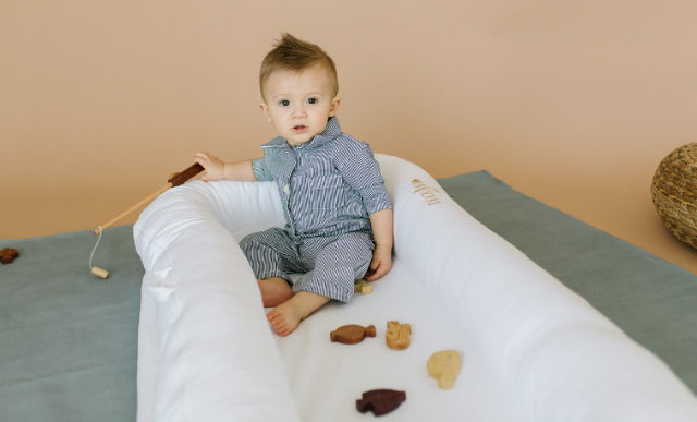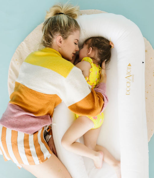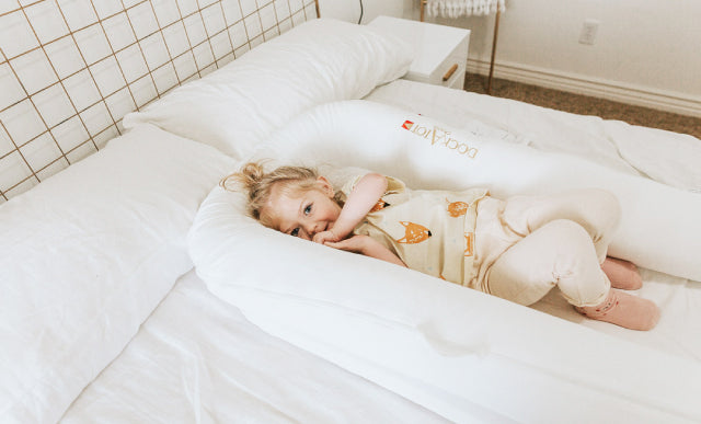大きなベッドの上でDockATotを使用することによって囲われている安心感でひとりで寝ることへの不安を和らげます。